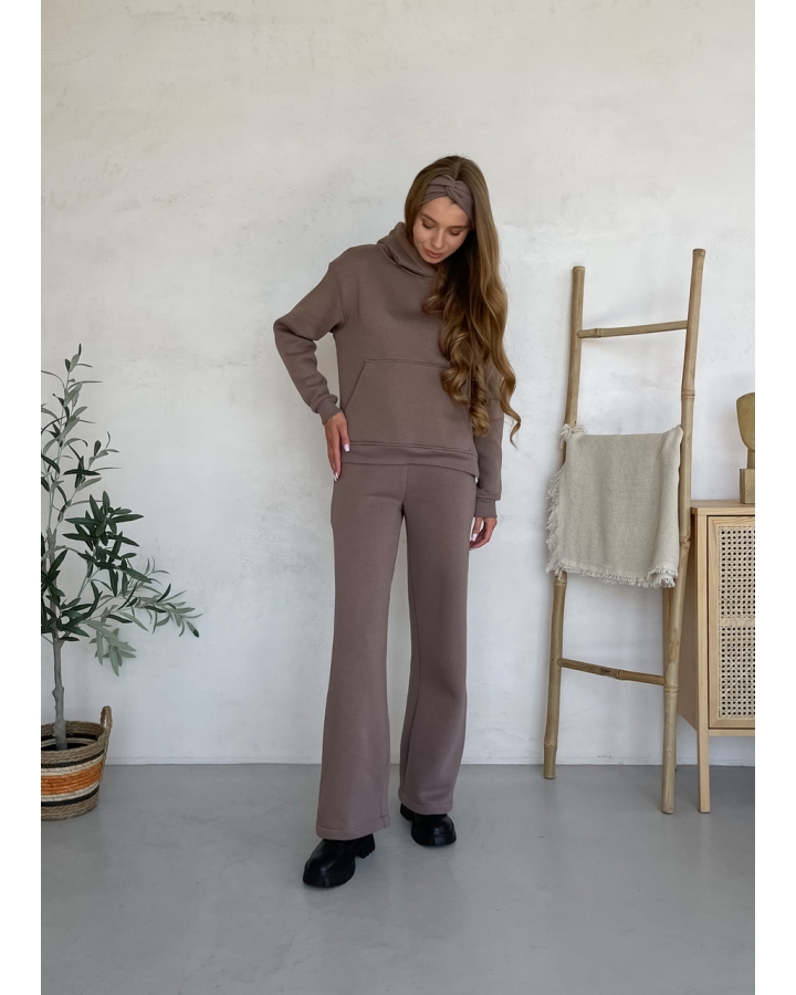 Теплий зимовий повсякденний костюм на флісі. Укорочена худоба з бічними розрізами. Манжети по дов'язі. На брюках кльош - кокетка для підкреслення форм.