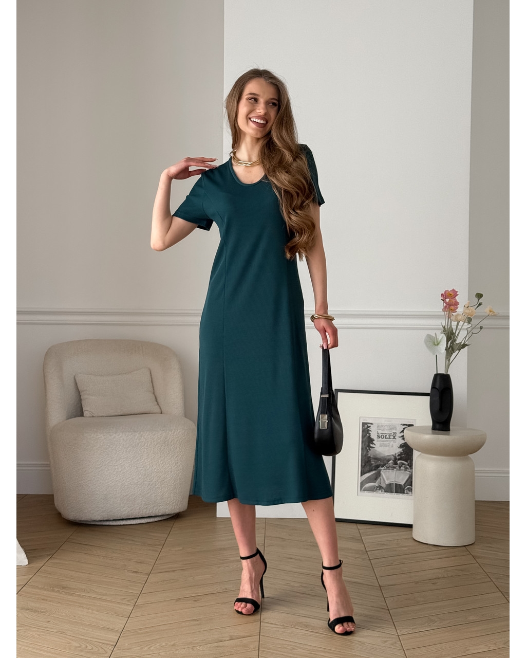 Вільна довга сукня-футболка з рубчиком А-силует, розширюється від талії до низу.