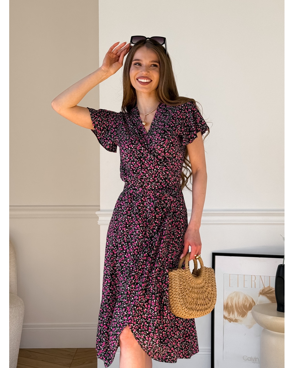 Сукня на запах із штапелю з квітковим принтом, не обтягує та приховує недоліки фігури.