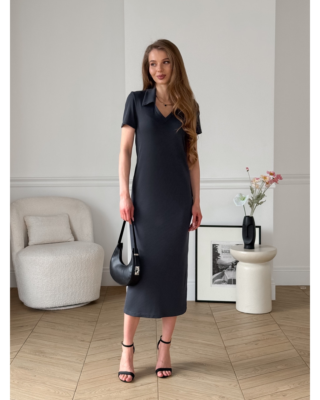 Сукня прямого крою з V-подібним вирізом та коміром. Неприталена, тому не обтягує живіт. Має бічний розріз.