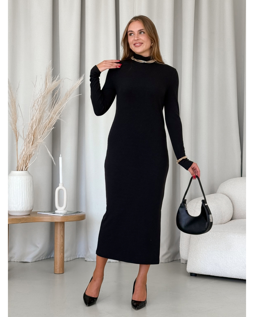 Сукня-гольф у рубчик з довгим рукавом. Сукня з високим горлом рівного крою з боковим розрізом, не обтягує і приховує недоліки фігури.