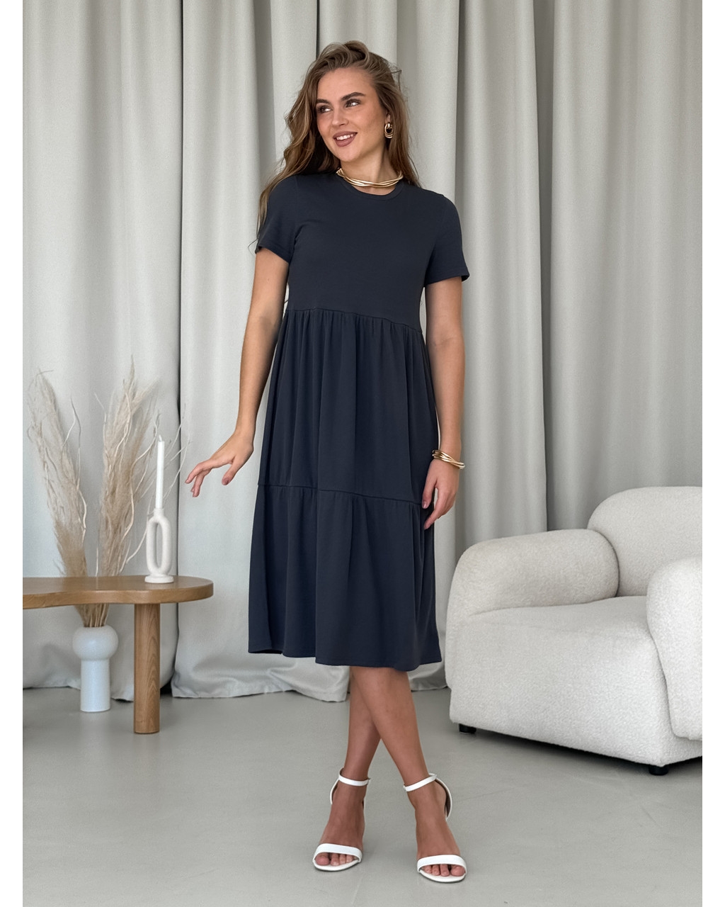 Сукня з вільними стегнами в рубчик сіра Redjo 700001584