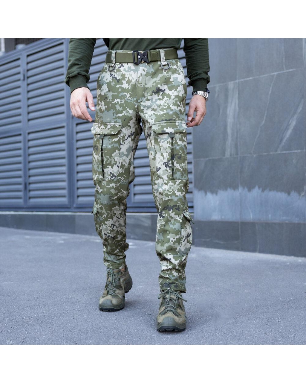 Чоловічі штани-карго "Hardy" - ідеальний вибір для справжніх чоловіків, які цінують комфорт, функціональність та стиль. Ці тактичні штани виготовлені з високоякісного софтшелу, що робить їх надзвичайно міцними та зручними для носіння в умовах мілітарі стилю. Основна особливість - це дев'ять функціональних кишень. Накладні набедрені кишені з двостороннім доступом, накладні кишені на гомілках та задня кишеня на водонепроникній блискавці забезпечують достатньо місця для зберігання речей. Пояс штанів застібається на ґудзик та блискавку, а також має шльовки для ременя з пластиковими півкільцями для додаткового кріплення. Вшиті резинки по боках забезпечують ідеальну посадку по фігурі. Низ штанини можна легко регулювати за допомогою липучки, що дозволяє носити їх з різним взуттям.