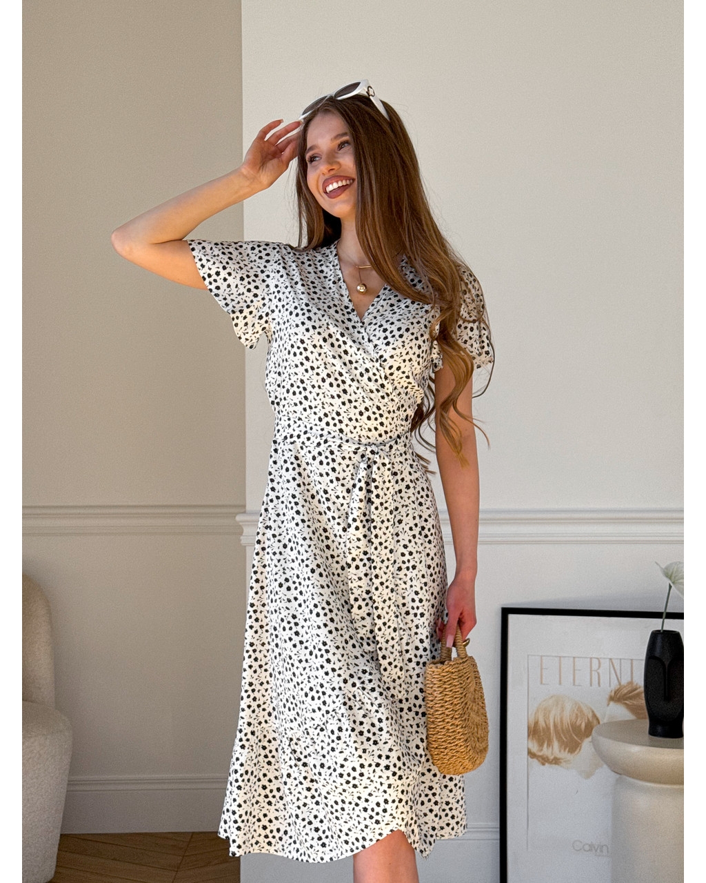 Платье на запах из штапеля с цветочным принтом, не обтягивает и скрывает недостатки фигуры.