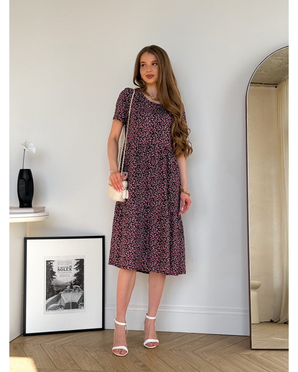 Платье трапеция из штапеля со свободными бедрами, не обтягивает и скрывает недостатки фигуры.