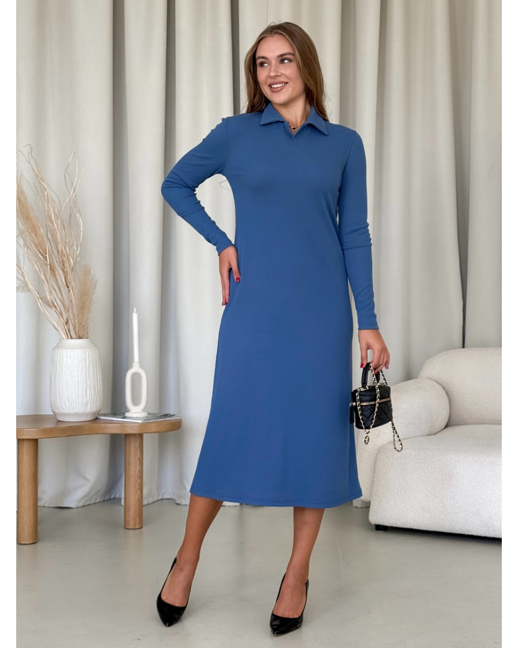 Платье-поло с длинным рукавом. Платье А-силуэтное расширяется от середины талии, платье не обтягивает и скрывает недостатки фигуры.