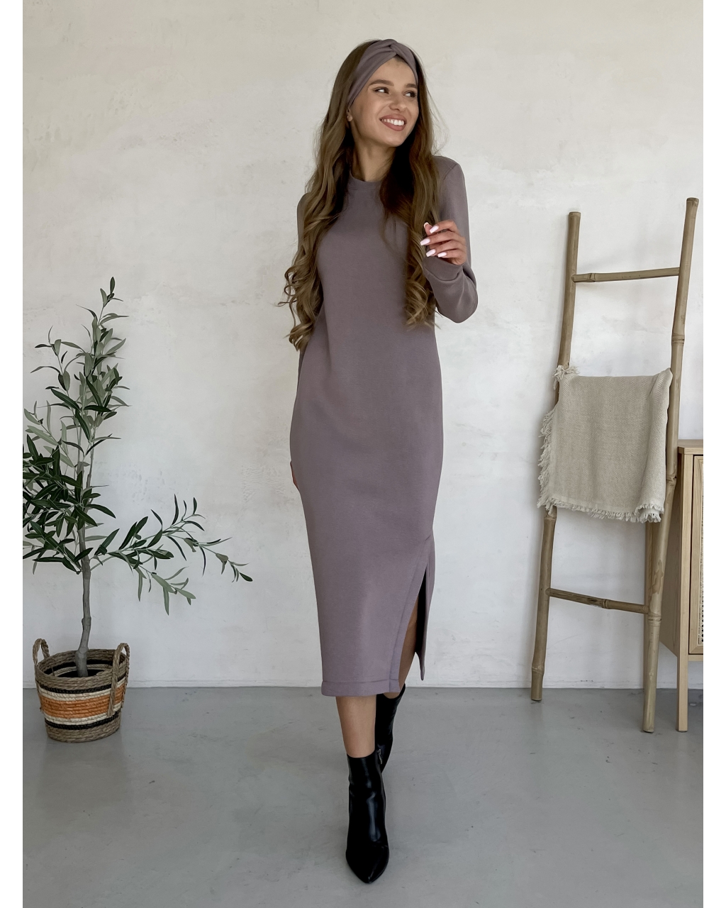 Теплое зимнее длинное платье на флисе с разрезом сбоку. Круглый вырез, манжеты из довяза.