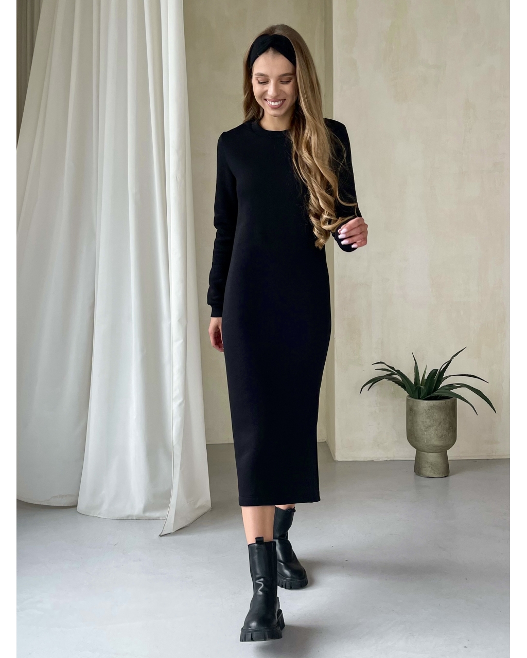 Теплое зимнее длинное платье на флисе с разрезом сбоку. Круглый вырез, манжеты из довяза.
